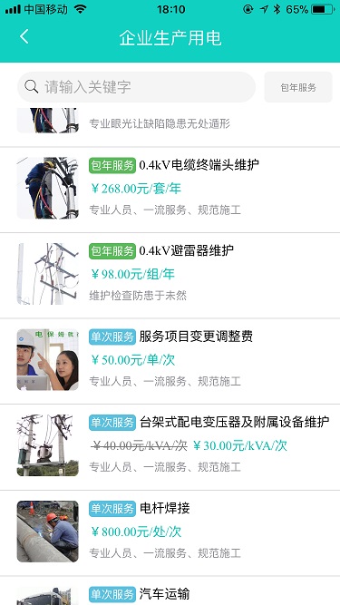 平台提供单次服务、包年服务、多个服务打包等多种方式;支持服务次数限定、服务区域设定,满足用电服务行业实际业务需求。